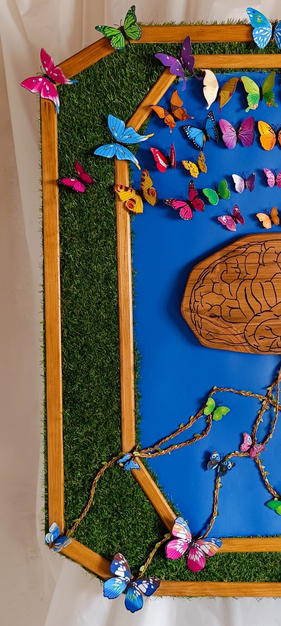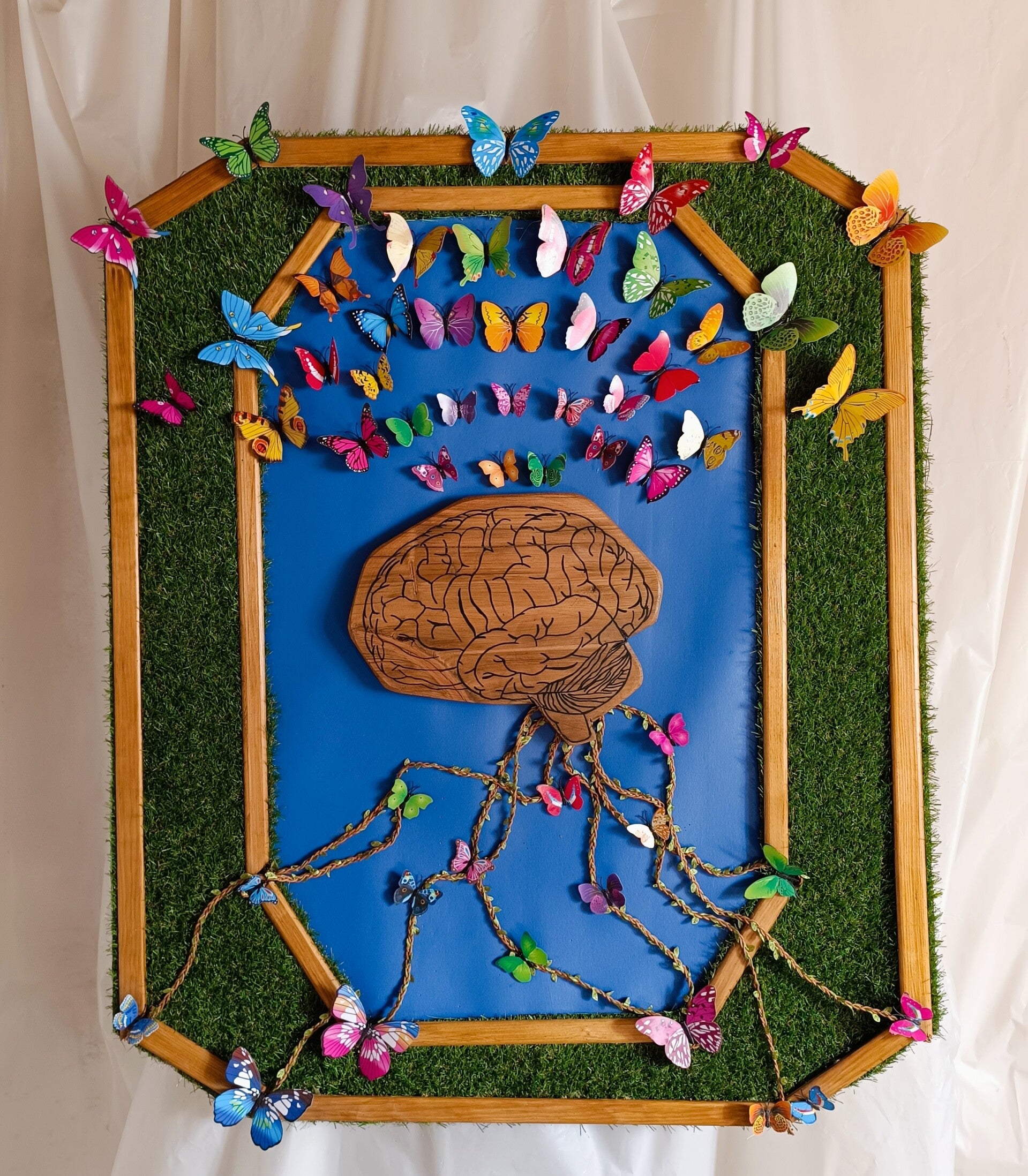 Cette oeuvre représente les Rêves, les imaginations et les pensées, composé d'un encadrement unique, avec au centre, l'llustration d'un cerveau en bois pour symbolisé notre faculté de penser : l'esprit humain