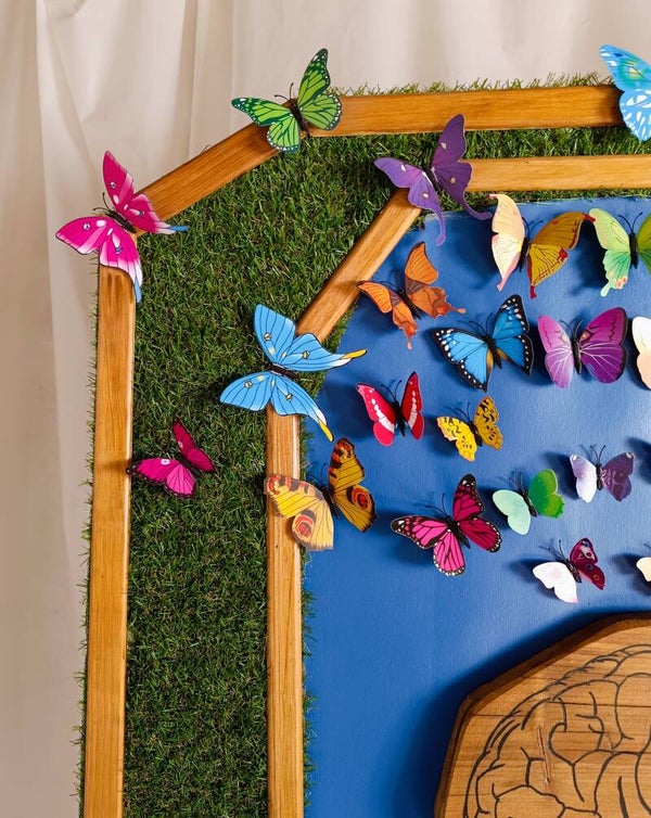 Des papillons multicoloré allant du plus petit au plus grand pour représenter l'évolution, et la liberté. Un fond bleu lisse représentant le liquide cérébro-spinal signifiant l'importance de la protection de nos rêves.
